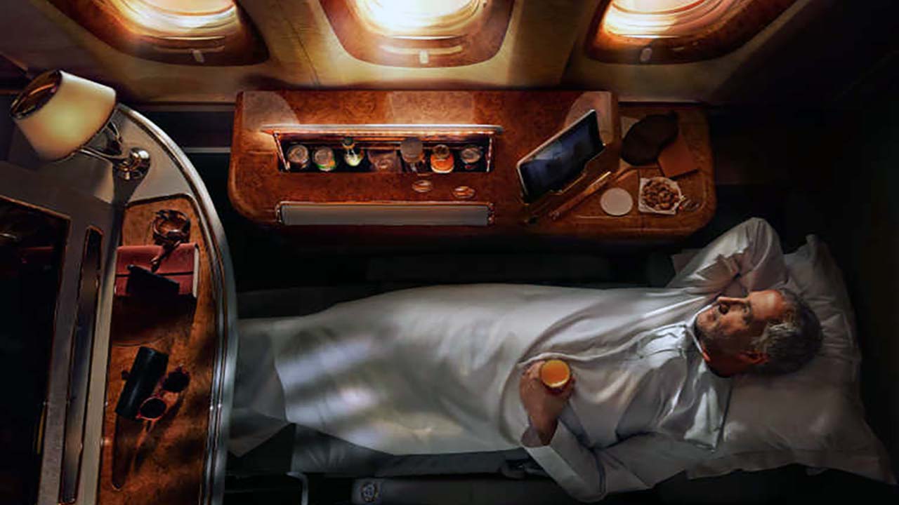 W samolocie, pasażer otrzymuje do swojej dyspozycji ultra-wygodny fotel, który rozkłada się w pełnowymiarowe łóżko. W oddzielonej od reszty pasażerów kabince jest także telewizor i barek. Do dyspozycji pasażera pozostaje też osobisty steward lub stewardesa, a posiłki z pokładowej restauracji (w dowolnej ilości i konfiguracji) serwowane przez eleganckiego kelnera.
