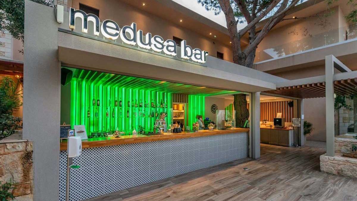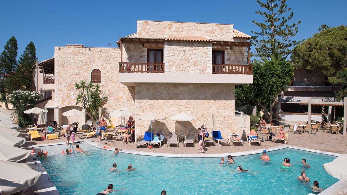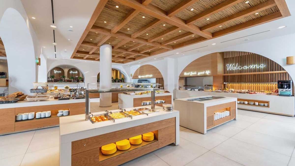 All Inclusive śniadanie (07:00-10:00), lunch (13:00-14:30) i kolacje (18:30-21:00) w formie bogatego bufetu w restauracji głównej. Ponadto w barach przy basenach kawa, ciasto, lody w godzinach 15:30-16:30. Napoje na zasadzie self service: lokalne napoje alkoholowe (piwo z beczki, wino krajowe, ouzo, raki, brandy, liqueur) i bezalkoholowe (woda mineralna, soft drinks, soki, kawa, herbata). Wieczorami 4 razy w tygodniu bufet tematyczny (włoski, chiński, kreteński) oraz bufet dla dzieci. Raz w tygodniu w ramach programu all inclusive możliwość zjedzenia kolacji w tawernie Paradise na plaży i raz we włoskiej restauracji (konieczna wcześniejsza rezerwacja).